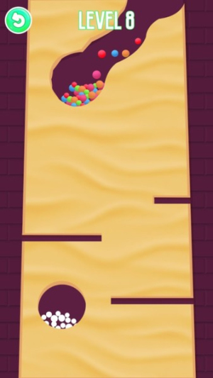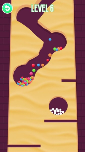 1、玩法挖沙引球:用手指在沙子中挖道路,引导彩色小球至白球堆并染色,每成功染色一组都满是成就感,适配休闲益智场景。