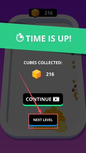 4、完成结算:出现216 TIME IS UP! CUBESCOLLECTED:216,点击NEXTLEVEL继续。