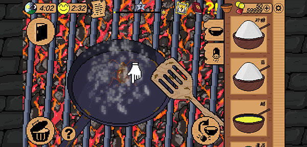 5、点击锅开始烹饪,按照菜谱要求,放入洋葱和蟑螂,再加入3勺糖,拖动锅铲进行翻炒,就可以了