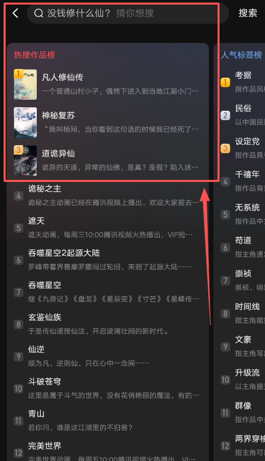 3、想知道现在流行看什么,就点开热搜作品榜,这里汇总了像凡人修仙传、神秘复苏这样的热门小说。