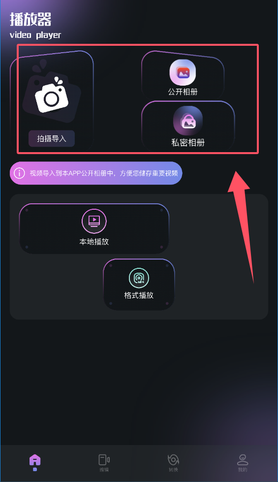 1、在首页,视频管理是核心,通过“拍摄导入”获取视频,妥善存放在“公开相册”或“私密相册”。