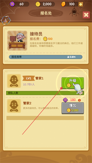 2、在报名处界面,点击升级按钮消耗金币,提升LV1管家的等级,增加接待学员的效率和人数。