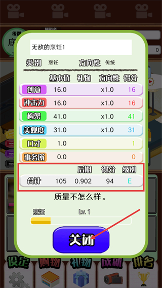 4、拍摄完成后查看结果界面,【合计-94】对应【级别-E】,了解内容质量后,点击【关闭】按钮退出该界面。