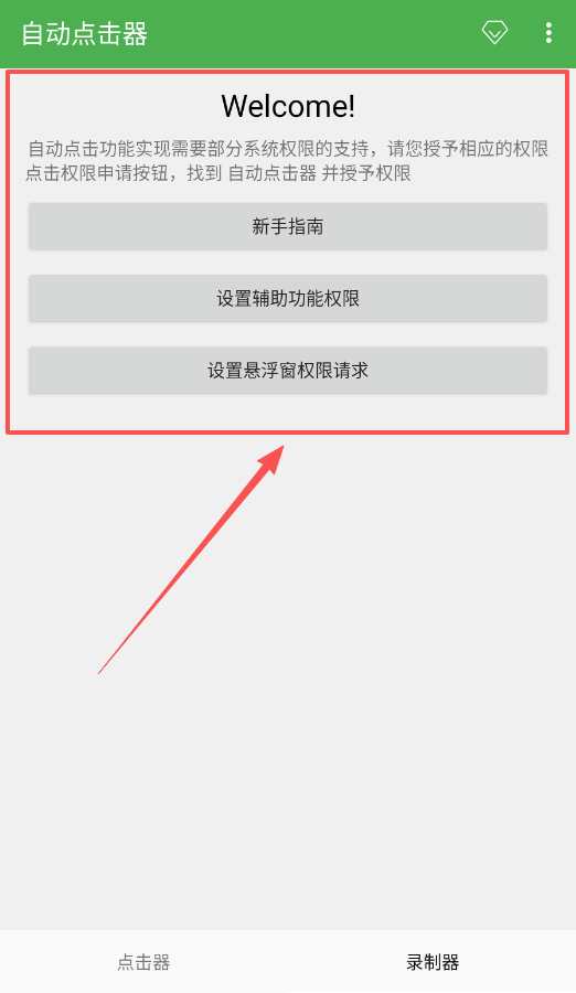 1、首先打开自动连点器app,点击【设置辅助功能权限】;