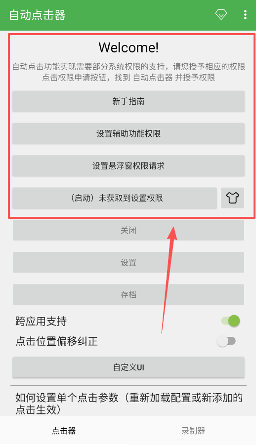 1、打开自动点击器后,在主界面点击权限申请按钮,然后在系统设置中找到并开启辅助功能与悬浮窗权限,这样软件就能正常工作了。