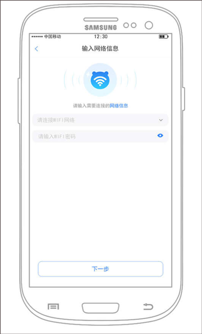 第三步:选择您所要联网的WIFI账号和密码并点击下一步。