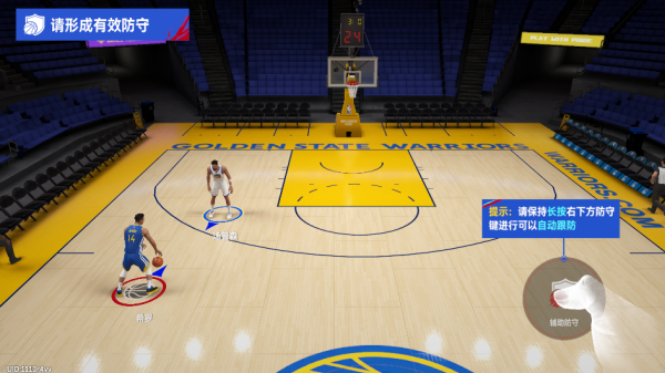4、当对手拿到篮球后,可以长按防守按钮进行防守,避免对方进球。