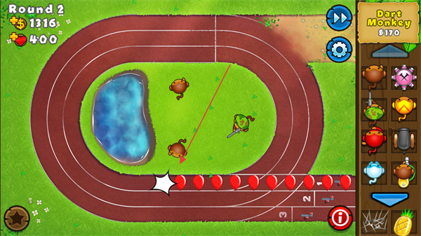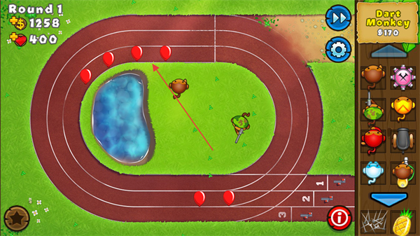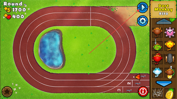 1、进入Round1关卡,准备部署DartMonkey等防御塔抵御气球。
