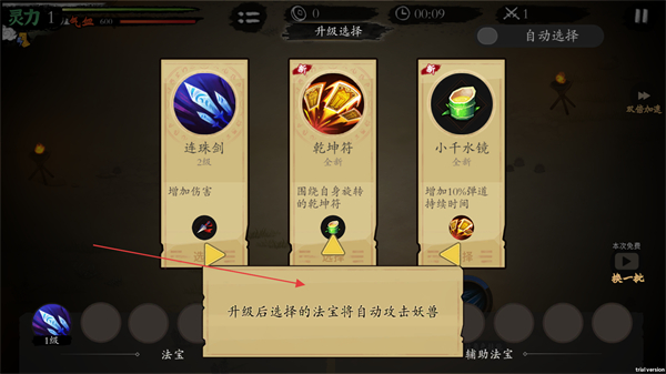 3、在升级选择界面选法宝如连珠剑,升级后法宝会自动攻击妖兽,提升战斗效率。