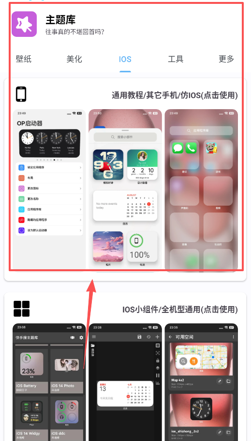 2、若喜欢简洁的iOS风格,找到并点击“仿IOS(点击使用)”教程,跟着步骤安装“OP启动器”,然后在其设置中自定义桌面外观即可。