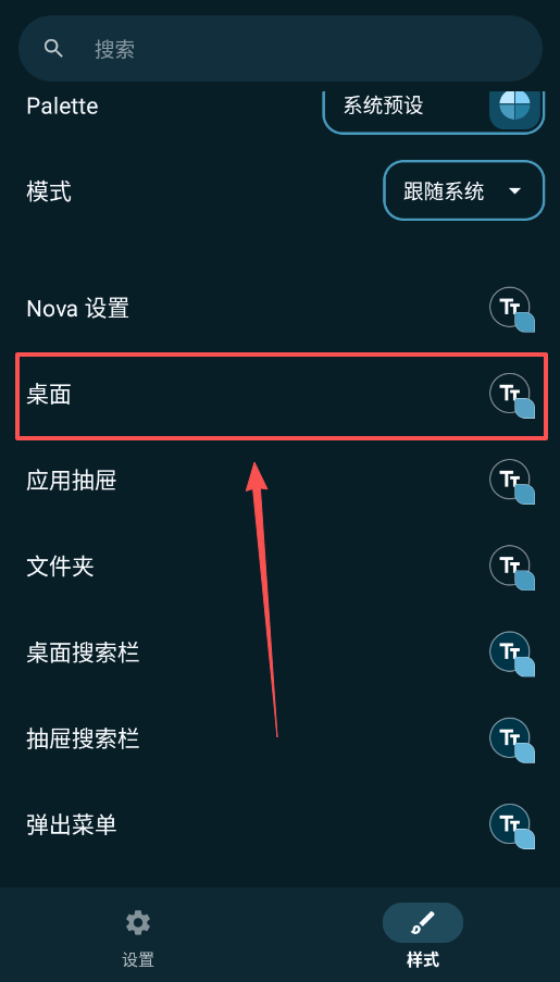 4、最后别忘了设置搜索,在“搜索”设置项中,你可以选择是否在桌面或抽屉显示搜索栏,并决定搜索栏的样式,查找东西更快了。