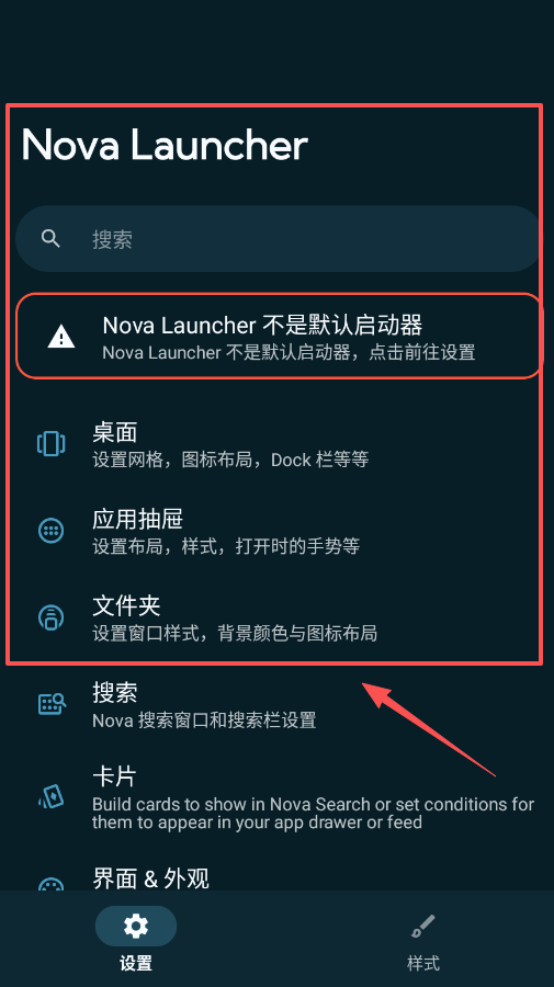 1、先解决默认启动器问题,如果看到提示“Nova Launcher 不是默认启动器”,直接点击那条提示,它会自动跳转到系统设置。
