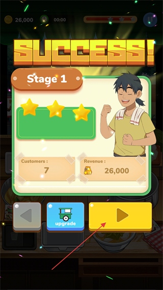 4、完成关卡后,获得三星评价与对应收益,可点击黄色按钮进入下一关,也可选择upgrade选项升级设施。