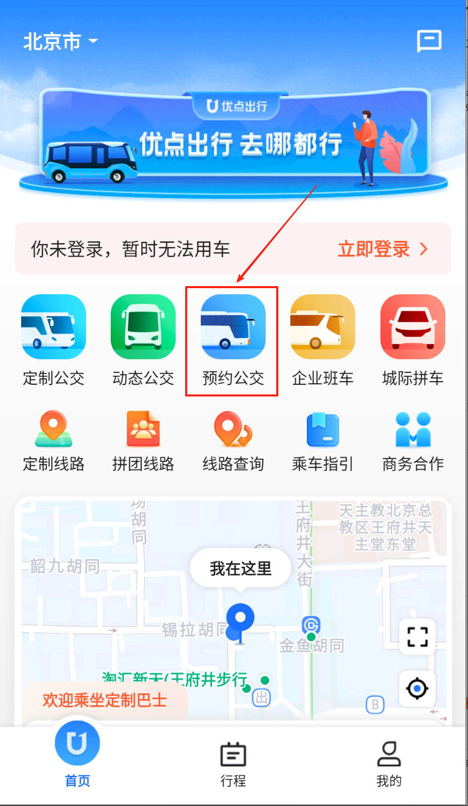 1、进入APP后,点击左下角“首页”,再点击页面内“预约公交”。