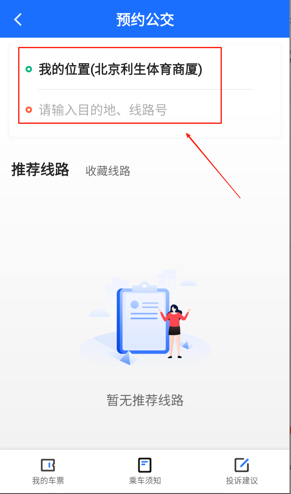 2、点击屏幕中间“请输入目的地、路线号”,输入想达到的目的地。