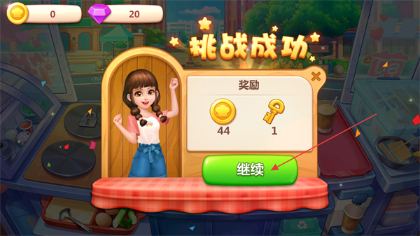 4、挑战成功后获得奖励,点击继续进入下一关。