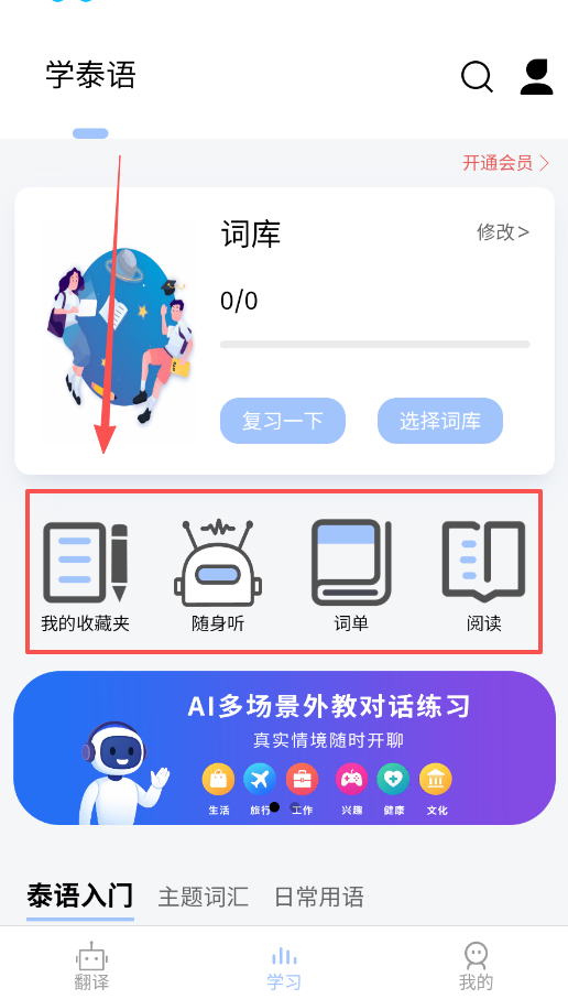4、最后管理个人学习,在“我的”页面可以查看收藏内容,使用随身听功能复习词汇,还能通过修改词库自定义学习计划。