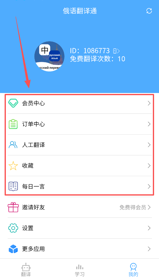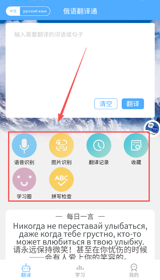 1、先打开翻译功能,在主界面直接输入中文或俄语,点击翻译按钮就能立刻查看结果,遇到喜欢的句子还能点收藏保存起来。