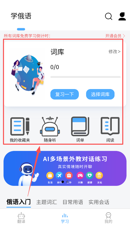 2、接着看看学习板块,那里有免费词库和俄语字母表详解,分成元音、辅音和硬软符号,适合入门者系统学习。