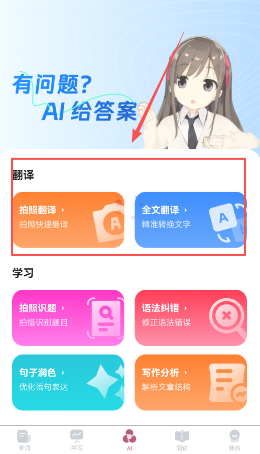 2、如果你是学生,遇到练习题或写作时,可以用“学习”模块,让表达更地道。