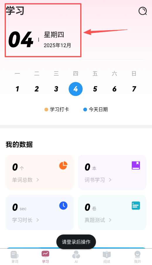 3、用户可以清楚地看到今天学习和重复的单词数,快速了解学习情况教学。