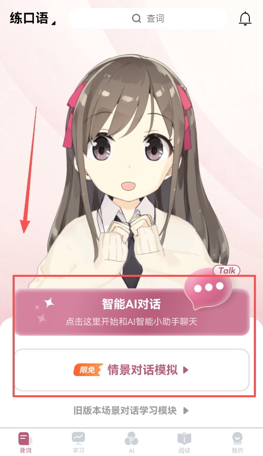 4、想练口语,就去“练口语”板块。最有趣的是“智能AI对话”,点击就能和AI小助手自由聊天。