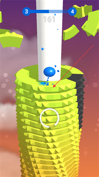 1、控制蓝色小球下落,击碎黄色堆栈层,得分提升至161。