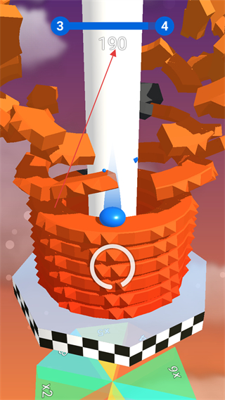 3、小球落向终点平台,击碎剩余堆栈层,得分升至190。