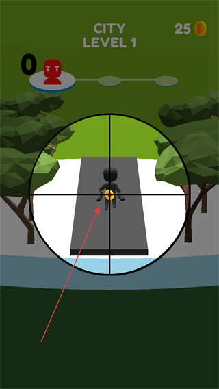 1、在CITYLEVEL1关卡,用狙击镜瞄准红色目标,准备射击。