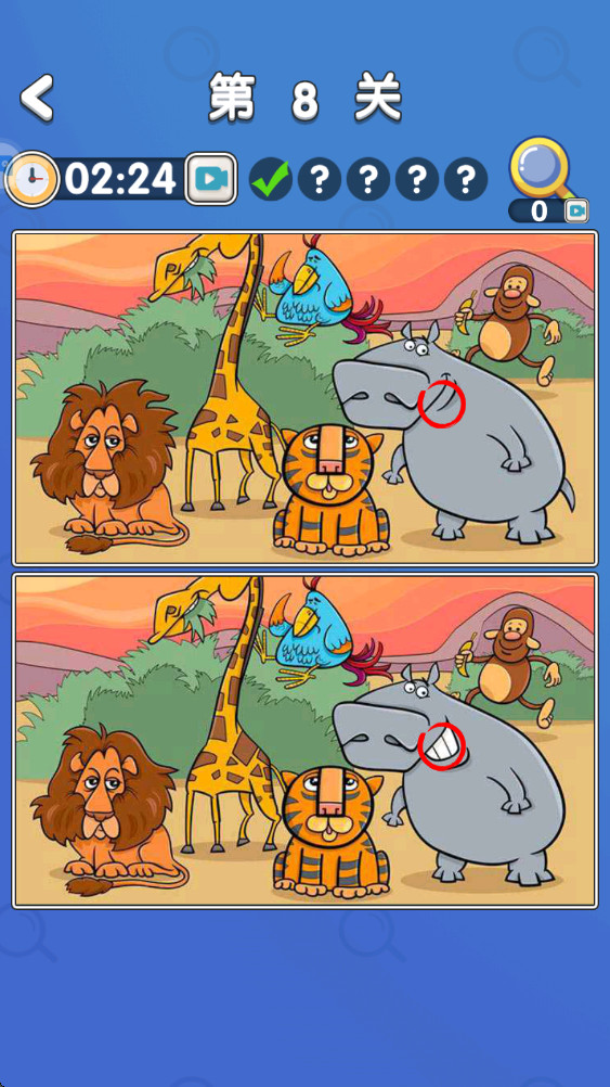 3.每个关卡有着不一样的难点,当你找不到不同的时候使用右上方的放大镜提示道具吧。