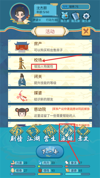 1、在【活动】界面选择【校场】,其功能为增加人物属性,结合当前【行动力-80】可进行属性提升类操作。
