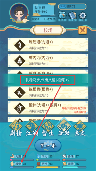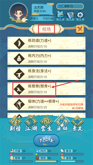 2、进入【校场】界面后,选择【练根骨-根骨+】选项,该操作消耗【行动力-10】,助力根骨属性增长。