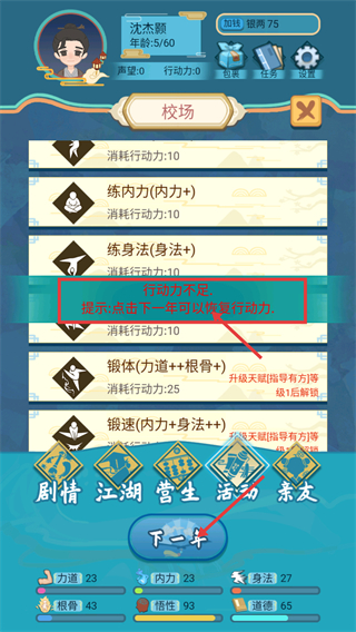 4、当【行动力-0】时,可依据提示【下一年可以恢复行动力】,点击【下一年】按钮恢复行动力以便后续操作。