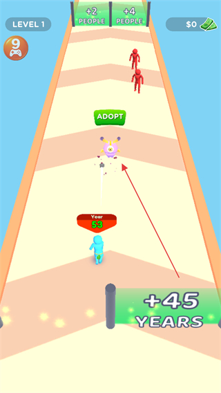 1、操控蓝色角色移动,点击ADOPT吸收红色小人,壮大人群规模。