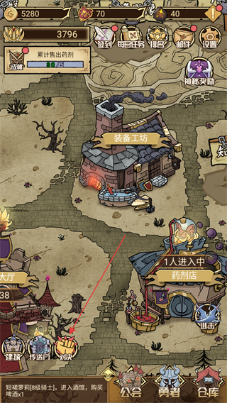 1、界面有装备工坊,药剂店等建筑,可通过功能按钮进入对应模块,推进游戏进程。
