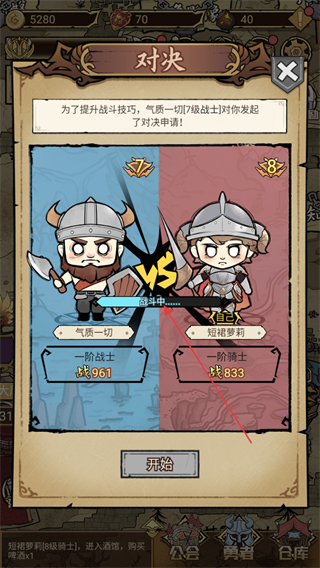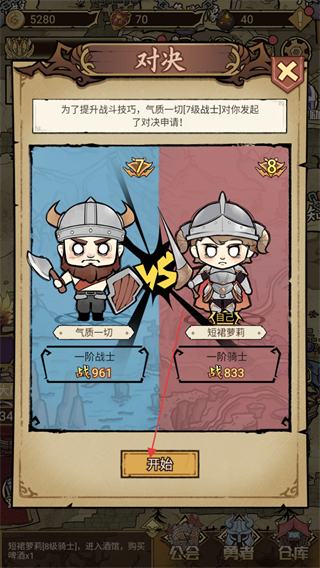 2、进入对决界面,查看双方勇者信息,点击开始按钮,开启对决挑战。