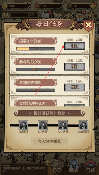2、在每日任务界面,查看招募3个勇者等任务,完成后点击领取获取奖励。