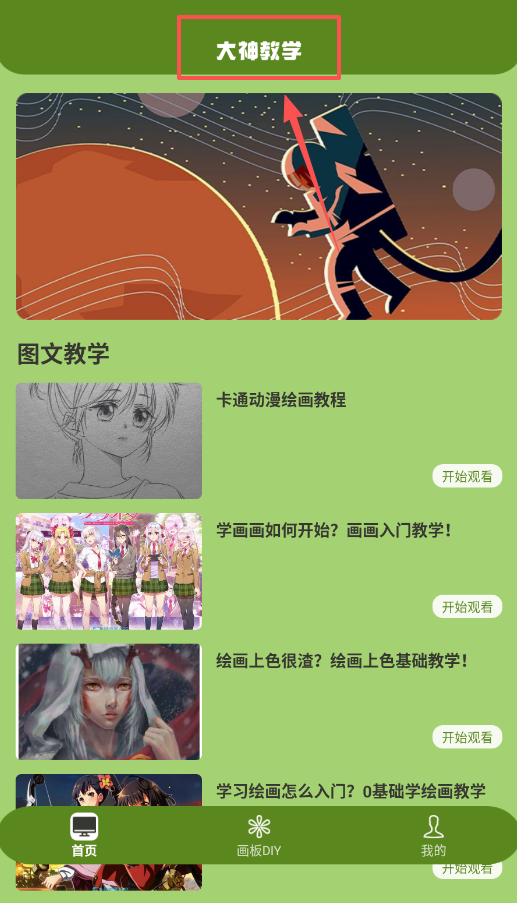 1、打开应用后,先看看底部导航栏的三个选项,点击首页进入“大神教学”区域,这里有很多适合新手的教程。