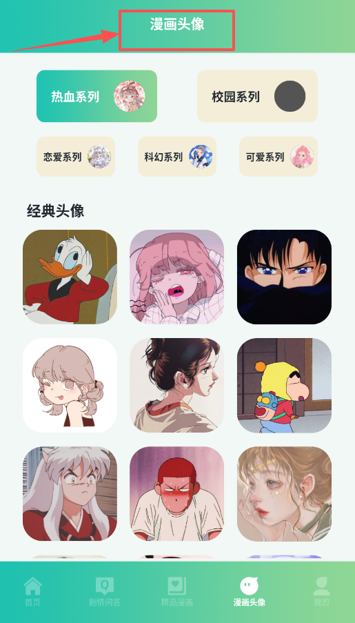 1、首页的设计突出了内容推荐,顶部的一级导航涵盖了剧情问答、漫画头像等所有主要功能,你可以像翻书一样轻松切换。