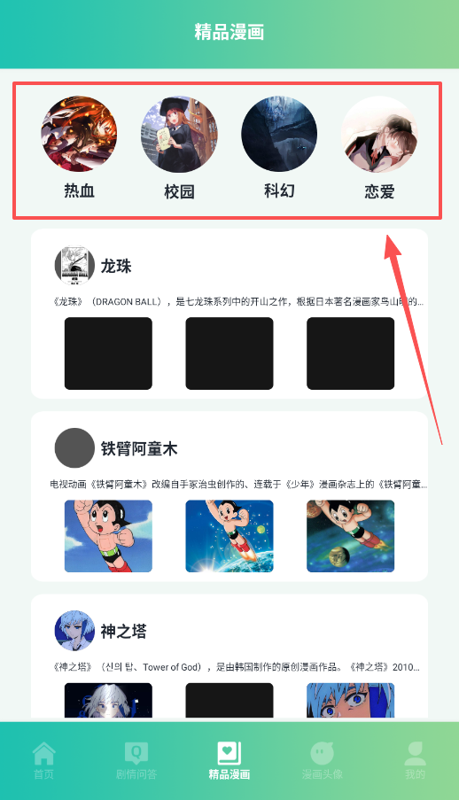 2、精品漫画板块就像一个分类书架,按科幻、恋爱等标签将作品归档,每部漫画,例如龙珠,都附有简要的背景说明。