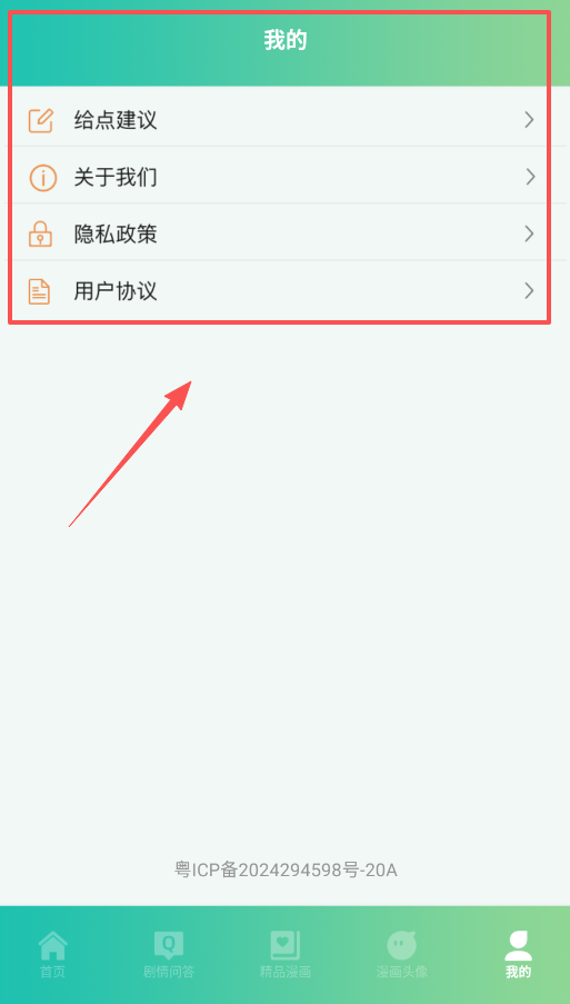 4、我的页面管理着应用的辅助功能,包括提供建议和查阅协议,页面最下方显示了网站的备案信息。