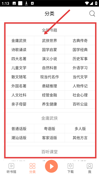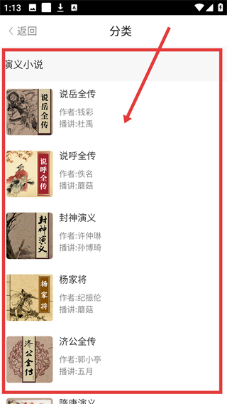 1、在分类页面选择【演义小说】类别,可进入对应的书籍列表页面挑选想听的内容哦。