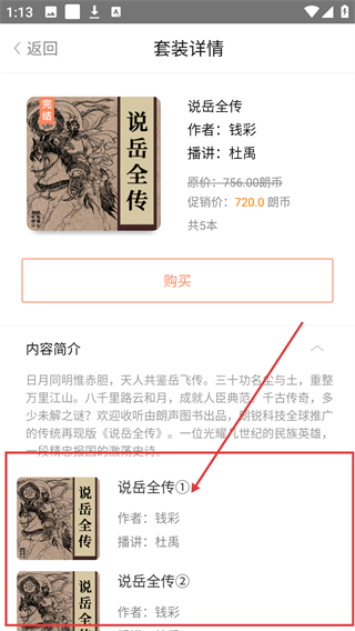 3、在套装详情页选择具体分册,比如【说岳全传】,点击可进入单册的书籍详情页哦。