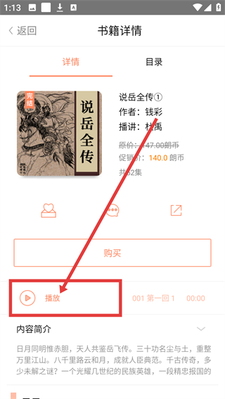 4、在书籍详情页点击【播放】按钮,就能开始收听这本有声书的内容啦。