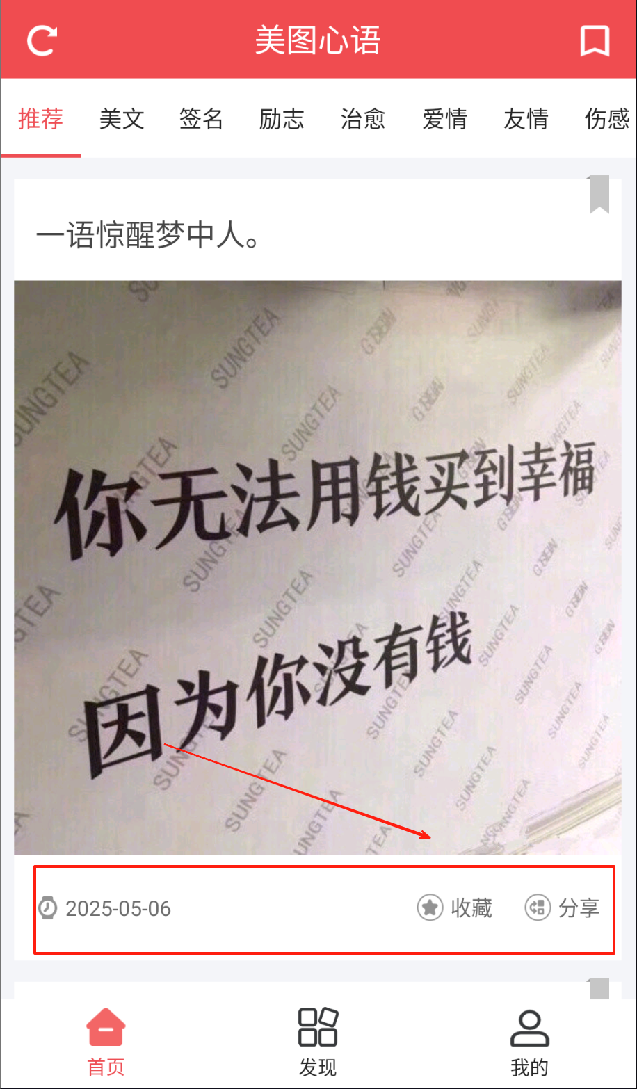 3、浏览推荐、励志等分类图文时,点击右下角收藏图标建立素材库,用分享按钮将好内容转发给好友,底部导航栏随时切换不同功能模块。