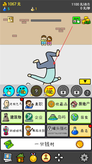 2、在一分钱村场景,点击金币按钮获取收益,解锁功能模块推进游戏。