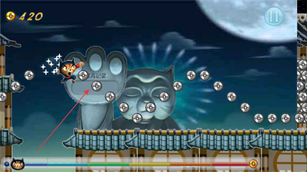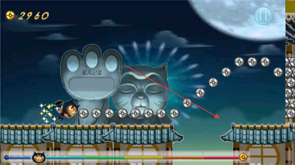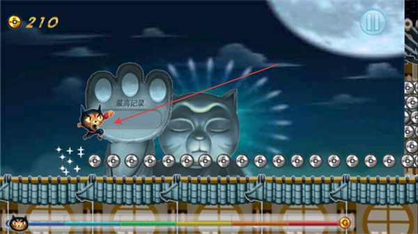 1、操控忍者猫移动,收集场景中的道具,积累分数,同时留意最高记录进度。