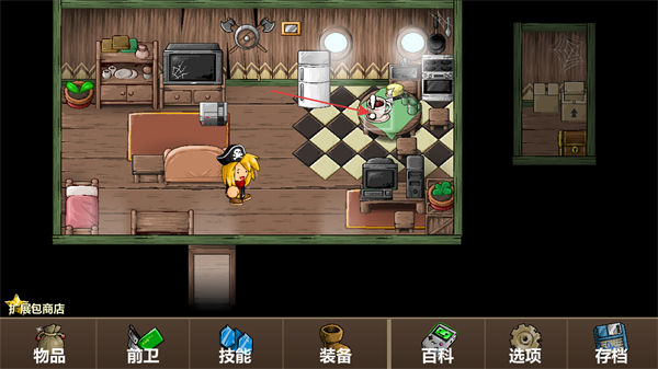 3、在室内交互场景中可点击场景内物品进行交互,同时通过底部物品、装备、存档功能栏管理资源配置装备,及时存档保障游戏进程。