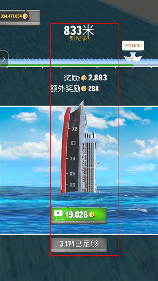 2、观察界面显示的跳跃速度数值,控制轮船在合适时机完成跳跃,同时留意跳跃距离的变化。