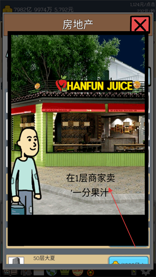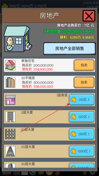 2、在房地产界面,选择1层商家等房产项目,点击对应按钮进行购买,积累资产。